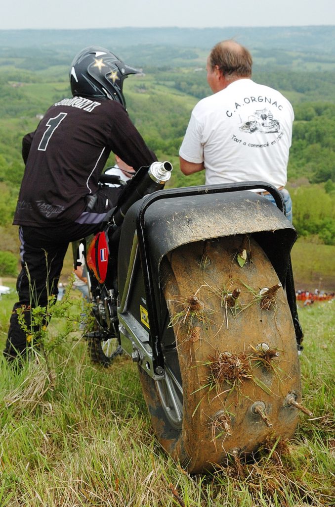 Believe it or not, the French national series attracts more spectators than any other national motorcycle championship there, proof of the crazy appeal of this gravity defying sport. Part of that appeal is machines like the missile powered by a 1000cc, two-stroke Millet twin engine. The owner baptized it the Scud 1000. “Put in your earplugs,” says the mechanic, who kicks it over energetically. It finally comes to life with a spine-tingling exhaust note that leaves me deaf.