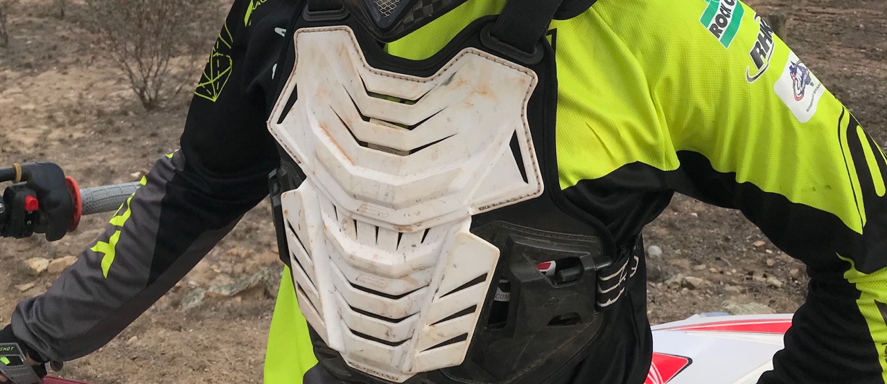 So I started wearing chest protectors and they’ve been my go-to for the last six or seven years. Lately I’ve been wearing the Axo Pentagon Bio Frame which is structured…