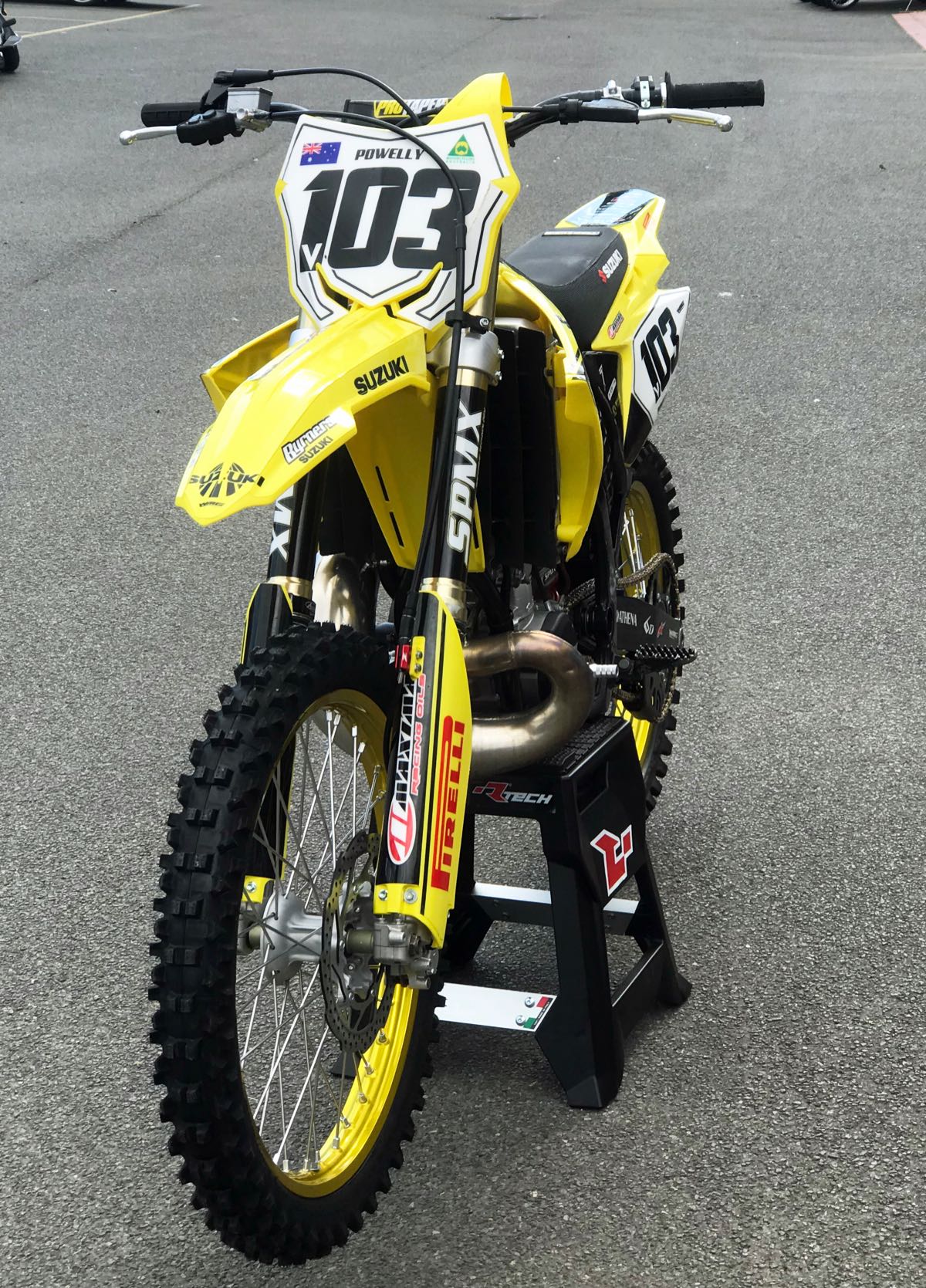“I cut the spokes out of the wheels and had the hubs hydroblasted. I fitted new wheel bearings and then laced the hubs to a set of bright yellow Excel rims from EZE Race Products with genuine Suzuki spokes. I always run Pirelli so I fitted a set of Scorpion MX mid-soft tyres. When it came to plastics I wanted to give it a more modern look so I went with a Polisport MX Restyling kit which gives the bike modern lines just like a 2019 RM-Z. It fitted really well and I love the way it looks.