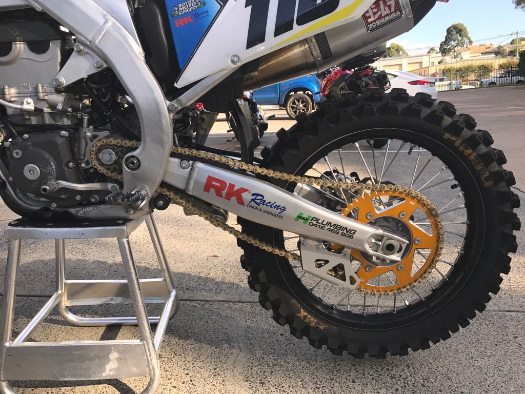 The original chain was starting to look a little shagged so I fitted an RK Racing chain and sprockets to the bike. The gold-anodised rear sprocket looks nice and flashy while the heavy-duty gold racing chain is slim, so it doesn’t chew out the guides. It has thin sealing rings that offer the same benefits as an O-ring chain while producing very little drag. The front sprocket is made of heavy-duty steel.