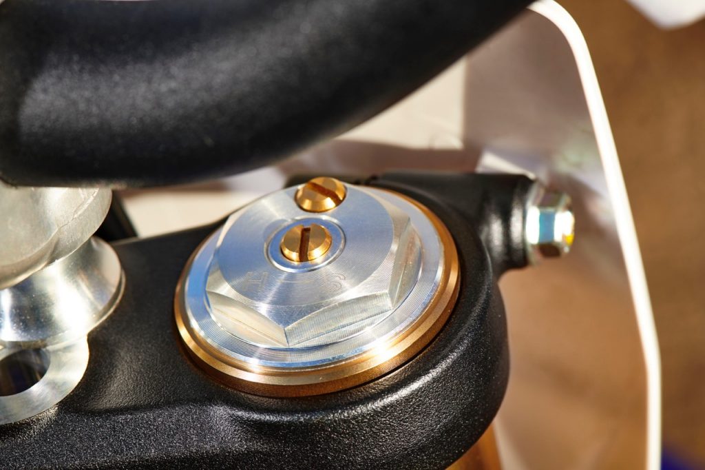 In the suspension department, a compression and rebound damping-adjustable KYB 36mm fork does the job up front and has 215mm travel. The shock (with 269mm of travel) runs without a linkage on an aluminium swingarm with YZ125-style chain adjusters. Like the fork, the KYB shock has adjustable compression and rebound damping.