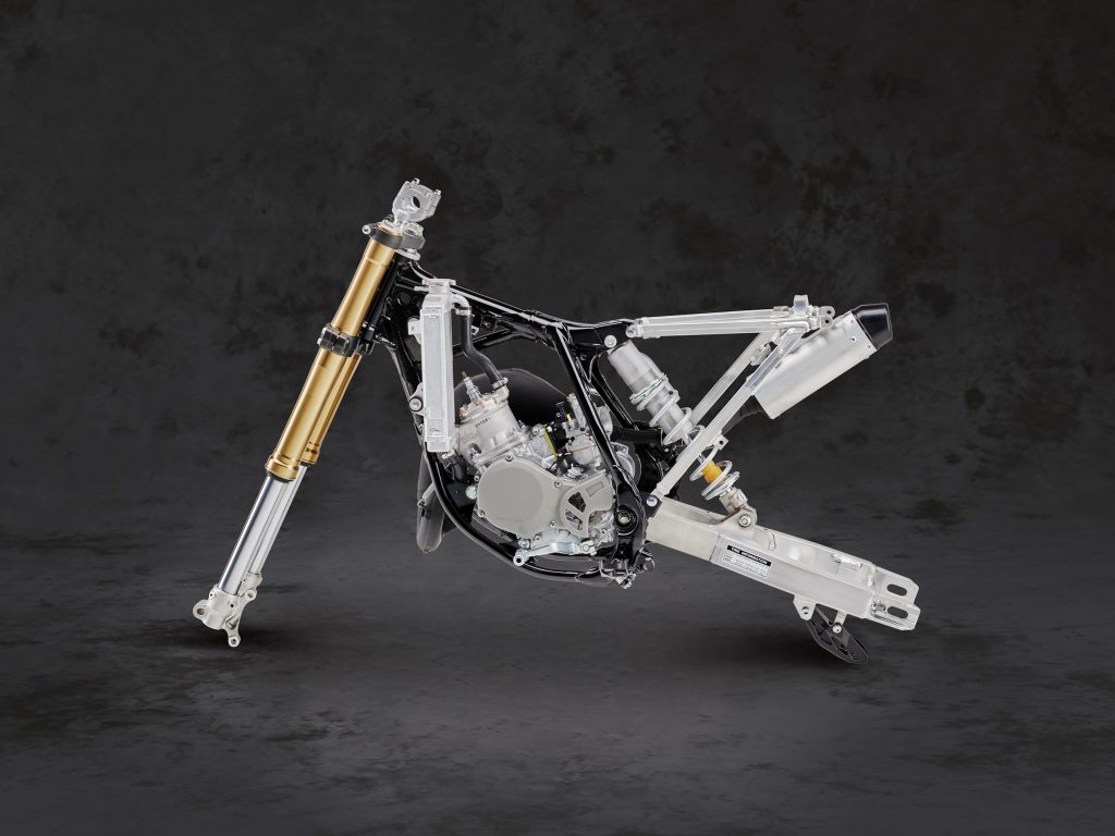 The chassis is based on the YZ85 design but is designed to meet the needs of 65cc-class riders. It features a steel-tube frame and removable aluminium subframe.