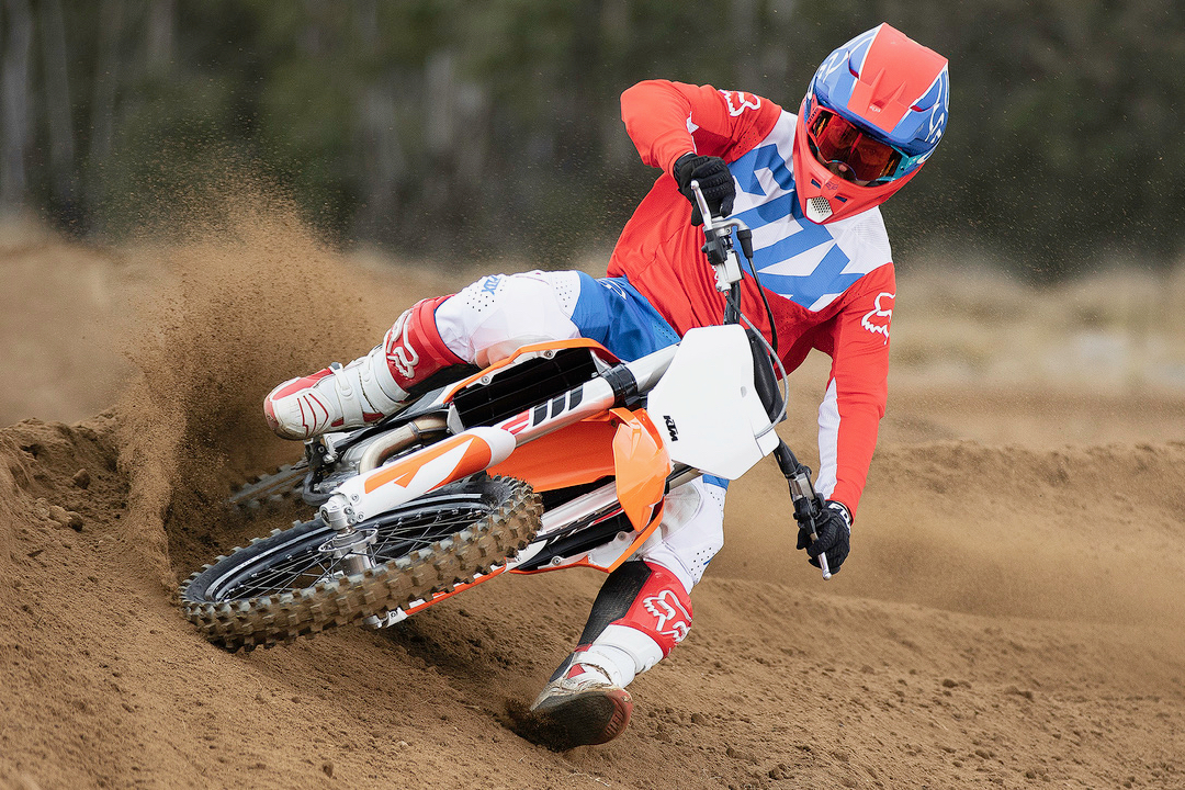 The KTM was really smooth and I felt that you’d notice the nice tractable power a bit more on a choppy, hardpack track. The hydraulic clutch and super strong brakes on the KTM are always a standout. The air fork had a bit of a dead feeling to it. I haven’t had much experience with air forks and they didn’t give me the same feedback as I was getting from some of the other bikes. And, to be honest, I expected a bit more from the KTM engine.