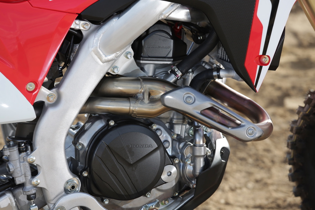 It was 2017 when we first saw the current-shape Honda CRF450R with its flat/aggressive profile, optional electric start, potent motor and agile chassis fitted with a new Showa 49mm spring-cartridge fork. For 2018, electric start became standard and the Honda engineers made everything a little plusher in the suspension and chassis department. And while the 2019 model looks almost identical, other than some nice looking and much stronger black DID rims and a completely different header pipe, there are actually plenty of changes, including a refined chassis that has more torsional rigidity, a new swingarm, new fuel injection system, new footpegs, new Nissin front brake caliper and new launch control setting.