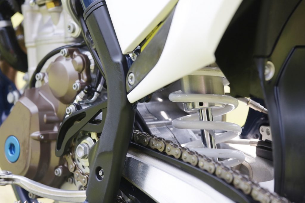 The engine weighs only 27.2 kg and churns out 58hp. Husqvarna also claims it is one of the lightest engines in its class, whichever class that is. For this year, the FC350 features an updated cylinder head casting process, which saves 200g. The head feature polished camshafts and DLC-coated finger followers, that allow the engine to rev to 13,400rpm.