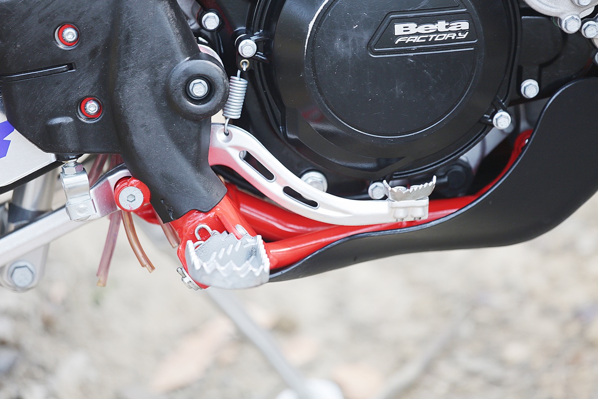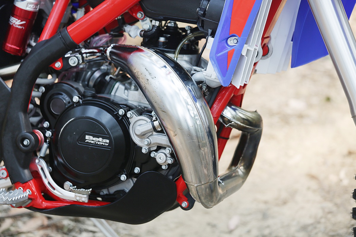 Beta has gone to a lot of effort to tame the mighty power of the 293cc engine. It uses the same 36mm Keihen PWK carb and oil-injection system but the expansion chamber has been shrunk and looks more like an RR125 pipe that wraps around a bit further, and the muffler is smaller too.