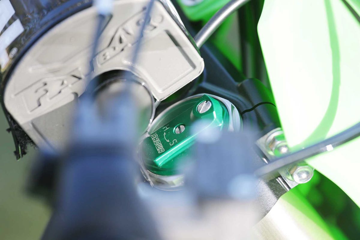 I expected to have to readjust the sag after the run-in period but, to my surprise, the shock preload didn’t need adjusting all day. I’m a big fan of the adjustment collar on the KX shock as you no longer need a hammer, punch and crazed expression to loosen the adjuster rings. Just an Allen key. I did make a small adjustment to the shock to speed up the rebound as I personally prefer an active shock. This is something I feel helps me keep the rear wheel on the ground during acceleration and braking.