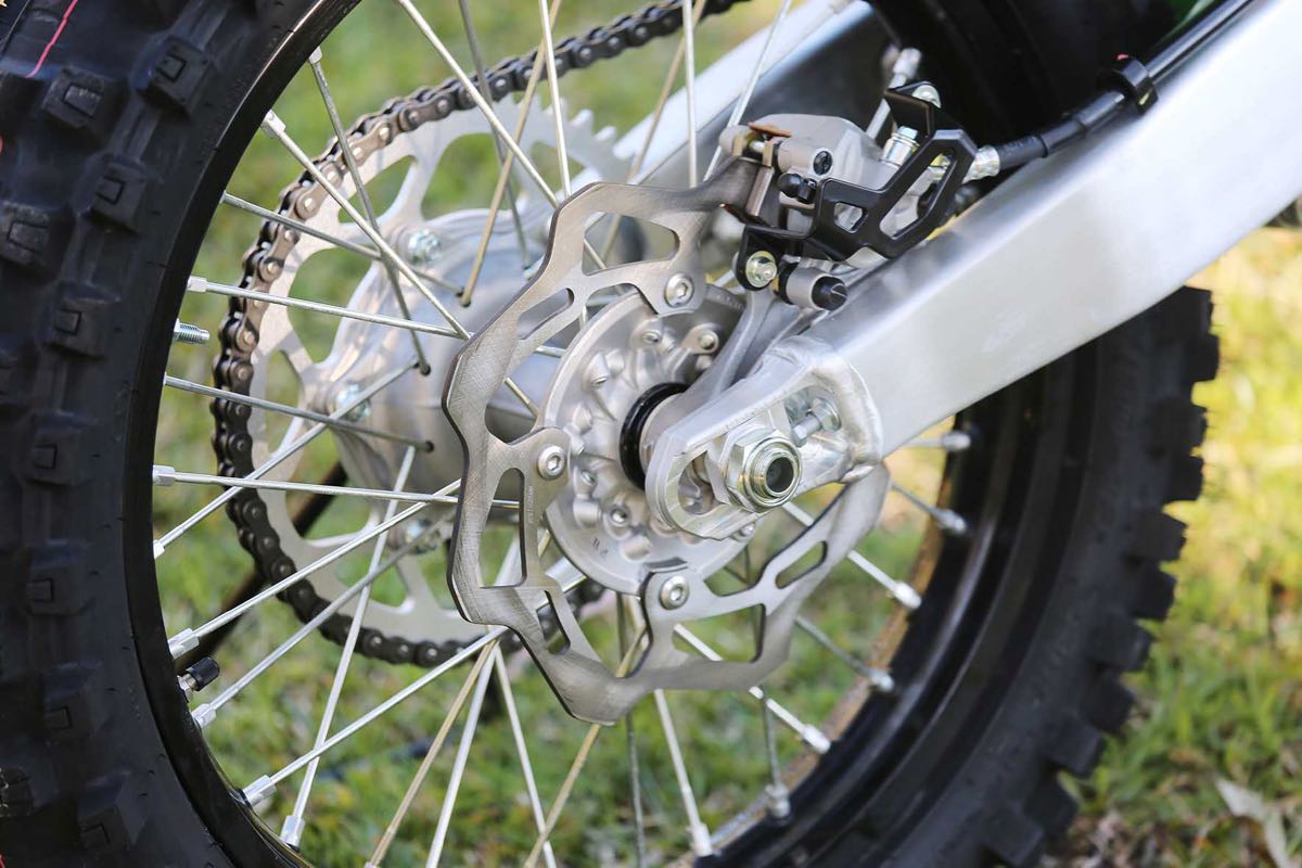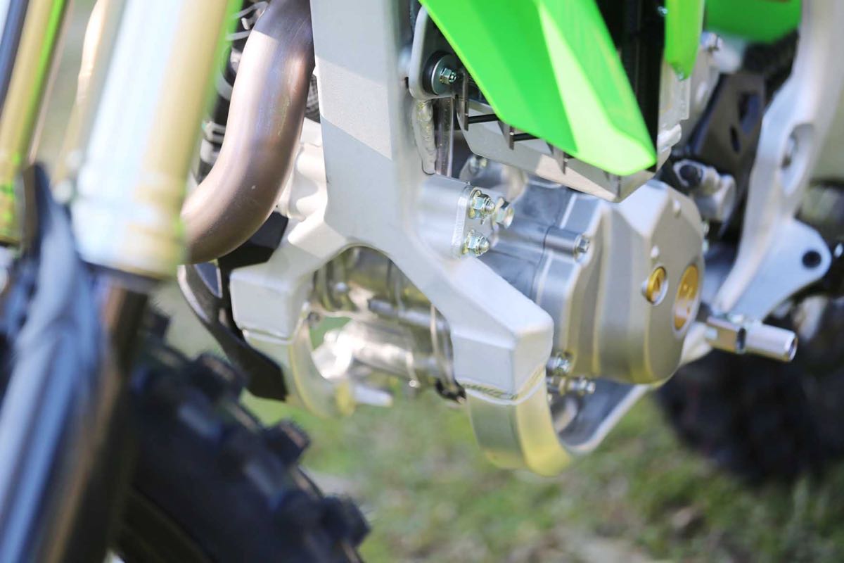 The engine is not the fastest in the bullring but the beauty of it is the mid-range torque and super-friendly power curve. The power is easy to get to the ground, making the KX an easy bike to control and ride fast. The suspension comes with Showa A-kit cartridges in the fork and is very easy to adjust.