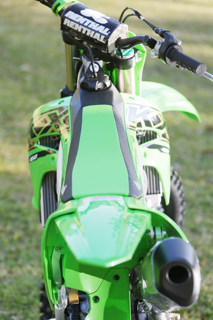 I’ve got a few minor gripes that have stuck with me from the moment I sat on the pristine KX. The handgrips feel like they’re made of the same rubber as the tyres plus they are so narrow you’d swear they came off an 85.