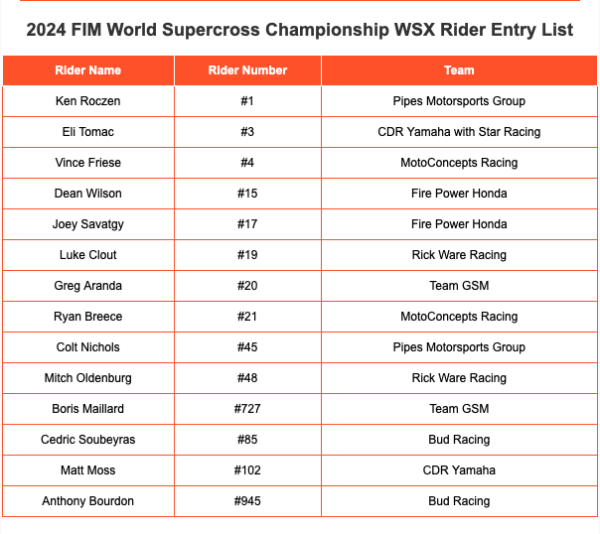 The FIM World Supercross Championship (WSX) has revealed its full WSX 450cc class rider lineup for the upcoming 2024 season.