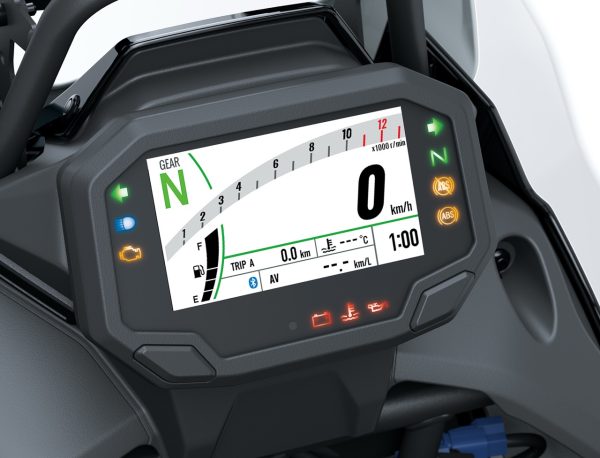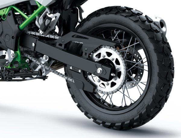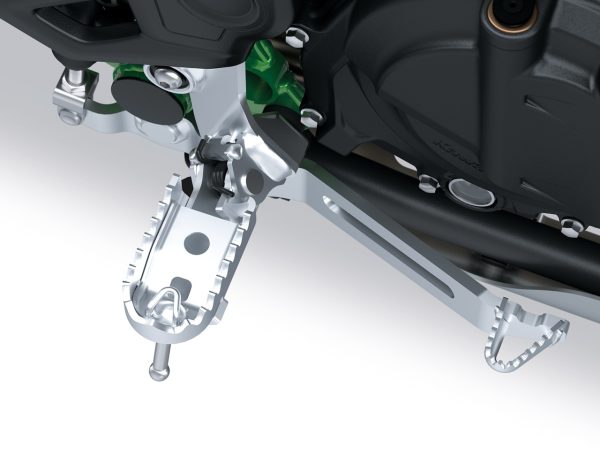 Ergonomics lean on KX motocross learnings. A wide, forward-set aluminium bar, a slim tank/side-cover interface for easy transitions, and removable rubber footpeg inserts (revealing off-road spikes) aim to make seated and standing control feel natural. Seat height is listed at 860 mm, with an optional Low Seat (-30 mm). Kawasaki’s ERGO-FIT options allow four rider/pillion seat combinations, including a flatter setup for technical off-road. Wind protection comes from a three-position screen (standard, +27 mm, +55 mm), and the 16-litre tank is shaped for ground clearance and rider movement.