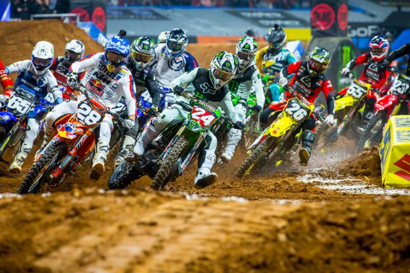 Monster Energy/Pro Circuit Kawasaki’s Austin Forkner grabbed the holeshot with teammate Adam Cianciarulo right behind. It looked like the teammates, who each led their points in their respective series, would go to battle but GEICO Honda’s Chase Sexton slipped past into the runner up spot. Cianciarulo stayed close, then pulled back up, and just over six minutes into the 15-minute plus one lap Main Event got back around Sexton and started setting faster lap times than his teammate just ahead of him. Behind them Monster Energy/Star Racing/Yamaha’s Dylan Ferrandis also got past Sexton. Ten minutes into the race Cianciarulo passed his teammate, and one lap later Ferrandis also went by Forkner. That’s where the top three racers stayed, giving the top two spots to Western Regional 250SX Class riders. The unique regional mash up allowed both division leaders to stretch out their points leads over many of their competitors, bringing the East Coast lead to 18 and the West Coast lead to 15.
