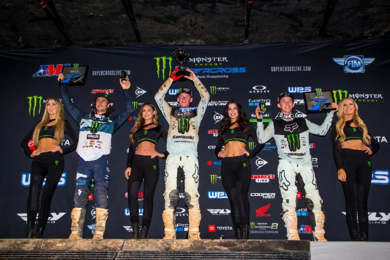 Ferrandis was very happy with second place, a completely different story from his race last season at the Atlanta round. The French rider said on the podium, “It’s a little bit like a redemption for me. I [left] last year this stage with a broken arm, a broken jaw – teeth, and it was tough to end a season like [that] with a stupid mistake. And I don’t know, maybe I was thinking about this a little bit today because I rode not so great, I was just tight and kind of a little bit riding with fear sometimes. I mean, it was good, I [got] a good start, my bike is amazing, the team decided to make some changes and it was definitely a good choice. Yeah but with this guy [Cianciarulo] we show West Coast guys are better. For sure I would like to finish in front of Adam because he’s leading the championship, but it’s a good night for me after four weeks out, and yeah, it’s good to be on the podium again.”