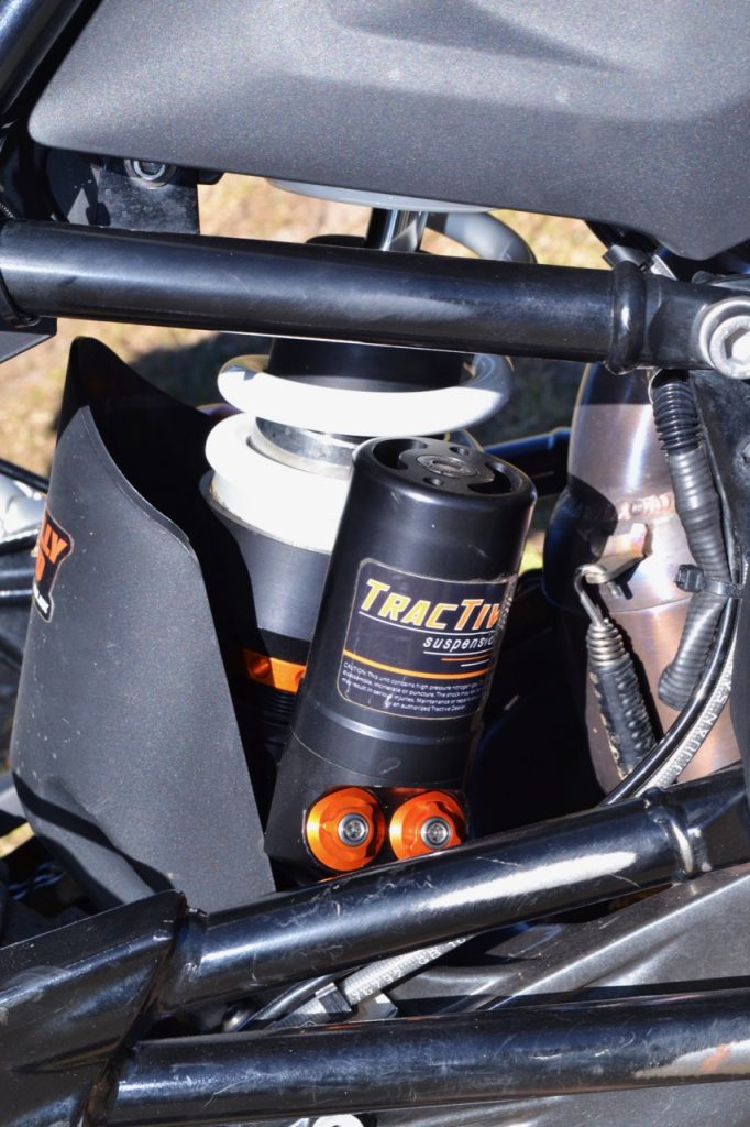 A minimal plastic skidplate is all BMW offers to protect the sump and cases of the EFI-fed 313cc six-speed motor; there aren’t even any frame rails below the donk, which is suspended from the backbone. Rally-Raid produced a comprehensive engine guard that covers the full length of the sump and extends forward up around the oil filter. With a tubular steel framework, the guard attaches entirely to the bike’s chassis, not to engine mounts which could be damaged by big hits on logs, rocks or G-outs.