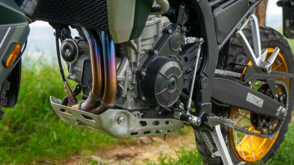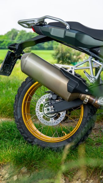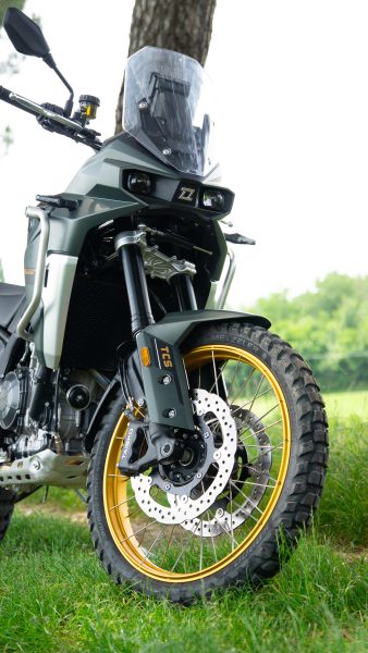 The 800X Pro is currently available in two colours – dark grey and dark green – and it displays a sleek bodywork with well-balanced proportions; nothing on the 800X Pro looks out of place or causes irritation at first glance. Parts such as the forged aluminium sidestand, and the cast steel footpegs, as well as the painted surfaces give a high-quality impression, while the gold-anodised rims give the 800 a unique and attractive look.