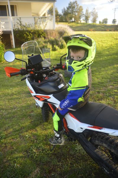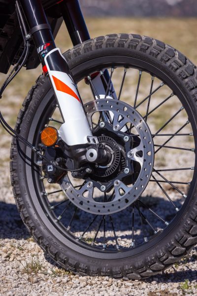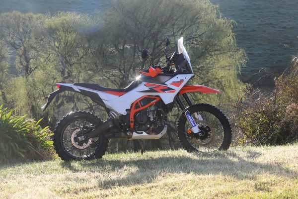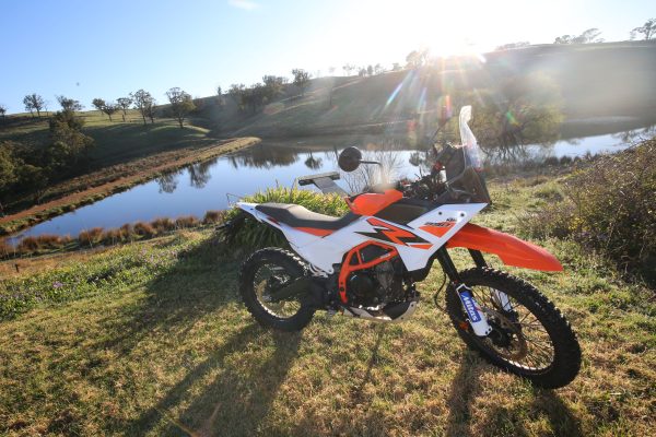 The bike looks great. The colours pop, and the inlaid graphics are well executed. The low exhaust looks fantastic and wasn’t overly loud. The bash plate is light-gauge but still capable of holding the bike when going over large trees. The provided Mitas tyres were excellent all-rounders, performing very well on both road and dirt.