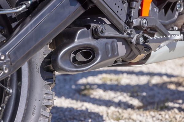 The frame is all-new, a two-piece steel trellis design based on KTM’s Gen 3 platform but thoroughly re-engineered for dirt duty. The steering head angle, triple clamps and rigidity profile have all been tuned for off-road stability, while new subframe mounts hold a one-piece seat and longer-stroke suspension. A bolt-on steel trellis subframe sits out back, built to cop the inevitable knocks from luggage or a nap in a creek bed, and the footpeg positions have been shifted to better suit both standing attacks and long spells in the saddle. To tie it together, KTM has fitted a gravity die-cast swingarm borrowed from the 390 Enduro R and SMC R.