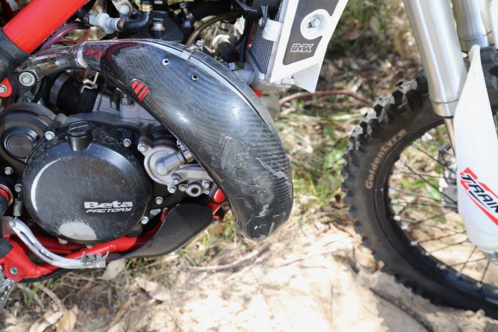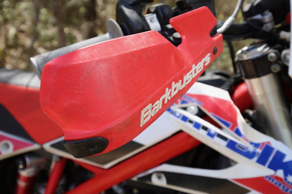 I then beefed up protection with a pipeguard, frame guards and linkage guard, threw on a set of sticky hoops from GoldenTyre once the stockers were worn and decked it out with an ADB-branded graphics kit from iMX Graphics. I decided against radiator guards because I was trying to keep weight down and I didn’t experience any radiator damage. And, of course, handguards. Gotta protect those golden digits.