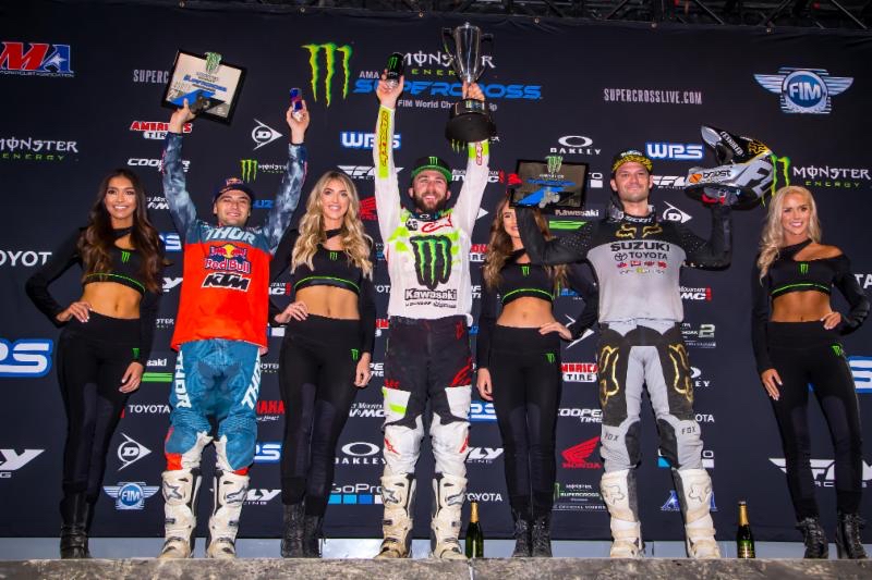 The final race of the night was a nail-biter as Tomac got a bad start then ran wide against a Tuff Blox and then off the track. He fought from as far back as fourteenth to finish in sixth. Baggett was the early leader, but Monster Energy Yamaha Factory Racing’s Justin Barcia was on the move, going quickly from fourth to the lead in the first four minutes of racing. Webb took advantage and got past Baggett at the same time then set his sights on Barcia. With under three minutes on the clock Webb dove under him in the same turn where Barcia had taken the lead. Webb pulled away, but Baggett became a factor in the closing laps. In the end Webb held on, beating Baggett by under half a second. Tomac’s 1, 1, 6 Main Event scores gave him the overall win; Webb grabbed second place, and holds onto the points lead with 6, 2, 1 scores, and Chad Reed stepped onto the podium for the 132nd time in his Monster Energy career courtesy of his 3, 5, 7 scores, which edged out Roczen by one point.