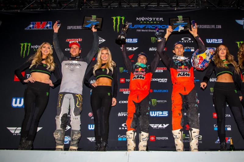On the podium race winner Cooper Webb said, “…Man, I’m stoked, I really am. I sat here in the Asterisk Rig [Mobile Medical Unit] the last two years, one with a blown-out shoulder, and last year with with a broken leg. And last year I contemplated a lot sitting right here in this very, exact stadium. It’s pretty bittersweet. It’s funny how the world goes ’round and, you know, it can be such a devastating moment in racing one year and the next year you’re at the highest of highs. So, it’s a pretty incredible journey, for sure, and man, just three wins is insane, it really is. I’m stoked, man, I really am. And to have it clicking like this, and I really enjoy these east coast tracks. You know it was hard to pass but [I] stayed patient and waited for a mistake from Joey and was able to capitalize and ride my own race and it was awesome out there…”