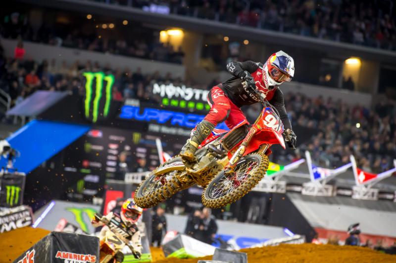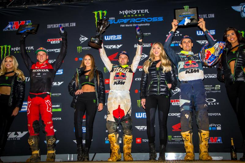 When the gate dropped on the 450SX Class Main Event it was Ken Roczen and Monster Energy Kawasaki’s Eli Tomac nearly side by side, with Roczen edging out Tomac for the holeshot. Within three corners Tomac was in the lead and Red Bull KTM’s Marvin Musquin had jumped into second. With Webb back in seventh it looked like this would mark the return of the old guard; before the first lap was over Roczen had re-taken second place and the three looked sure to fill the podium, only the order was in question.