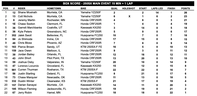 In the 250SX East Coast Main Event Yamaha rider Shane Mcelrath scored his third Main Event win of the season. He beat fellow Yamaha rider Colt Nichols and Honda’s Jeremy Martin.