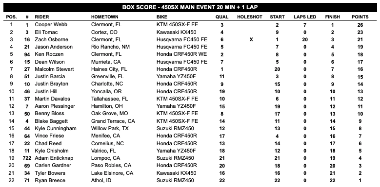 Tomac is still in charge of the championship points standings with a 13-point lead over Roczen in second place and a 29-point lead over Webb in third.