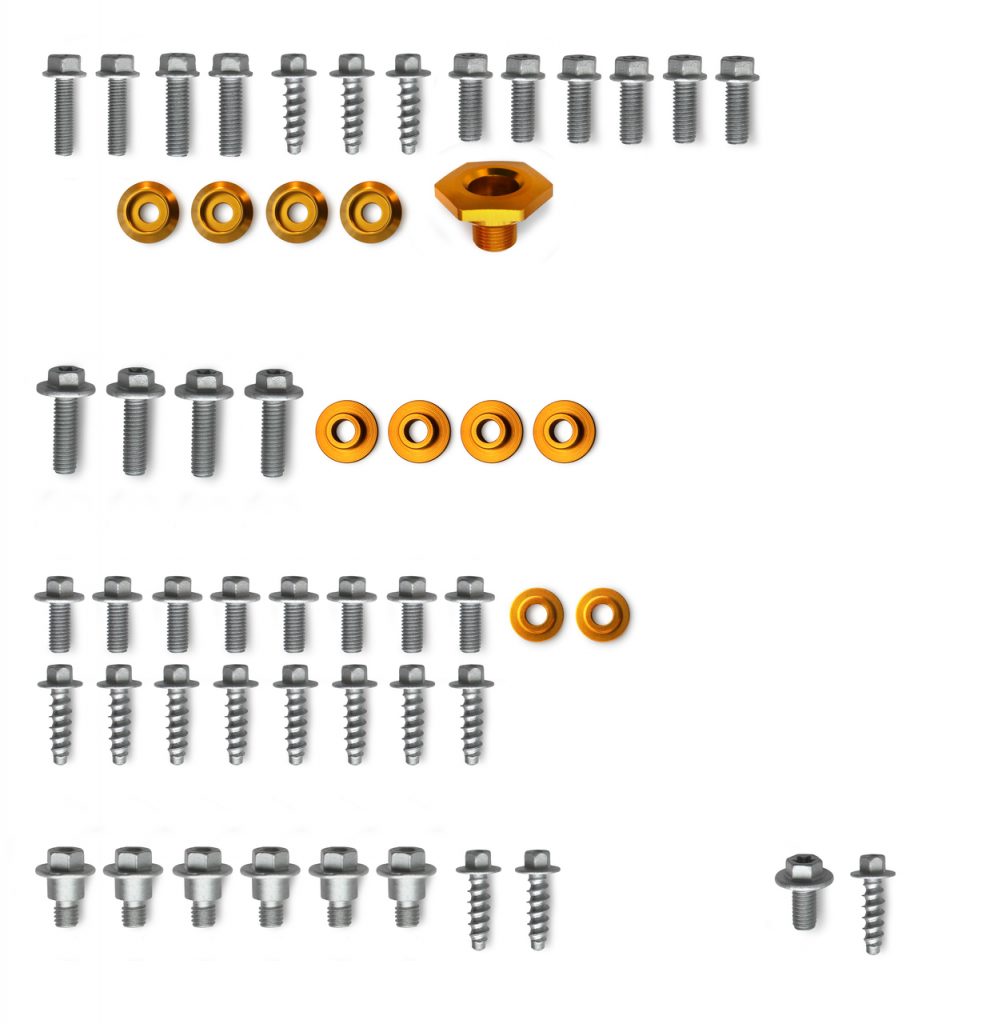 Supplied in a Race Ready container, bolt kits include anodized Factory Gold finish on all washers and grommets while the multiple year fitment means bonus hardware may result depending on which bike you’re fitting out!