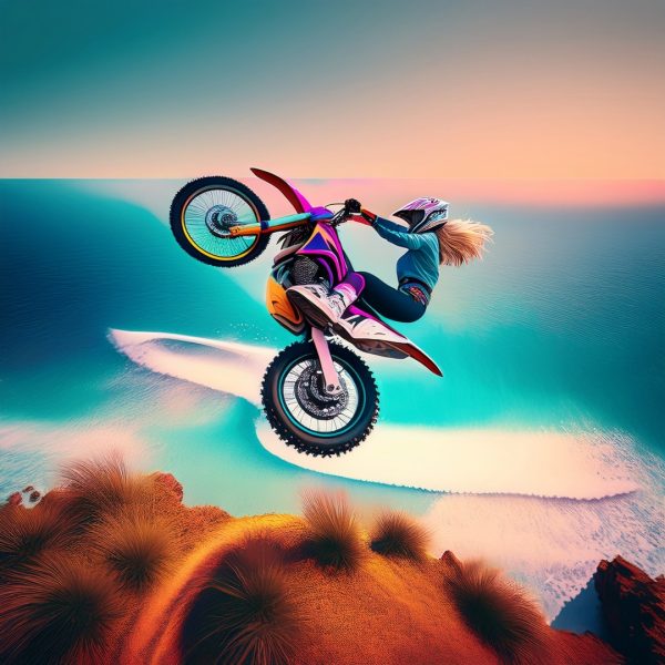 She twisted the throttle, the bike roaring as it surged forward. The ramp got closer and closer. ‘Braaaap!’ The engine screamed as she hit the lip. She leaned back, twisting the throttle perfectly as the bike left the ramp. Time seemed to slow. The bike spun backward, Bonnie’s eyes fixed on the horizon as she spotted her landing.