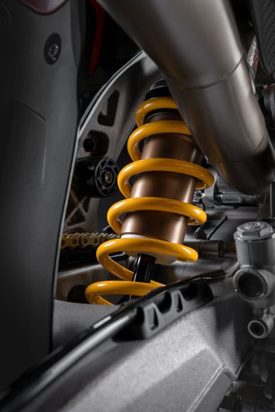 The Desmo450 Factory suspension was developed with Showa to improve performance and reliability for racing use. The surface hardness of the fork legs and shock absorber rod is increased by 60% thanks to titanium oxide treatment and superfinishing, thus improving resistance to wear and chipping from gravel. The Dark Kashima treatment on the fork sliders and shock absorber body increases smoothness, improving the ability to copy bumps and therefore increasing rider confidence. The fork is fully adjustable, with 49 mm upside-down stanchions and 310 mm of travel. The shock absorber is fully adjustable, with 301 mm of wheel travel.