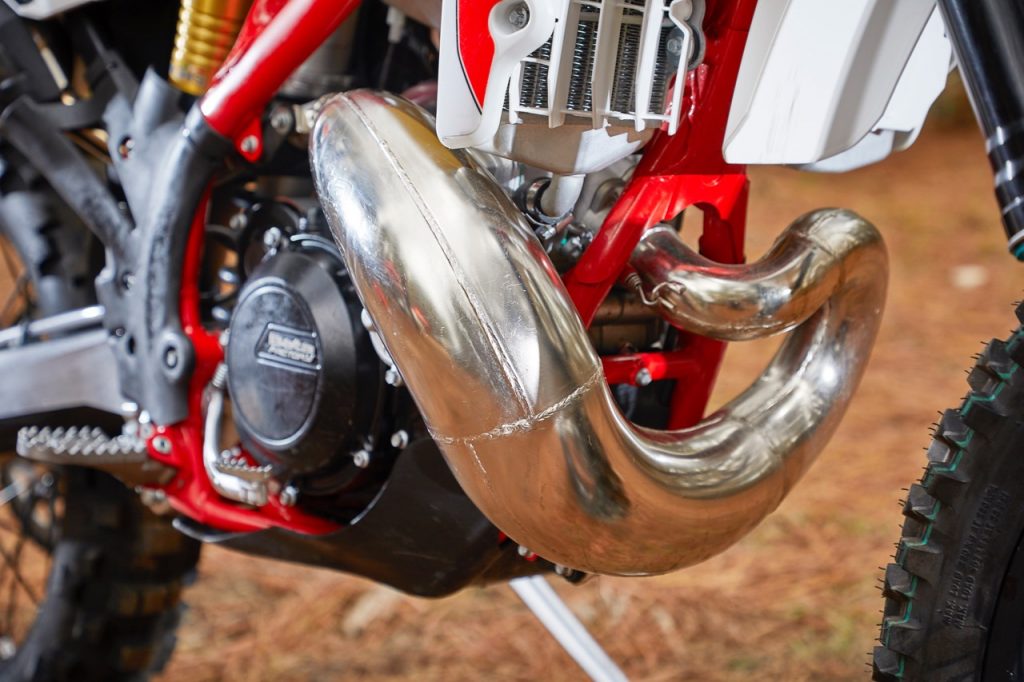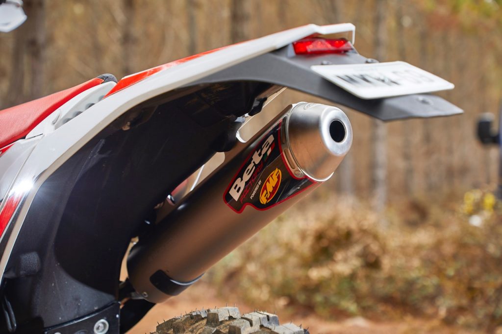 This is where the RR300 wins big points in my book. While some brands ask thousands more for a machine with comparable standard equipment or, in one case, thousands more with less standard equipment, the RR300 comes with a map switch, tapered ’bar, 2T oil injection, lithium battery, Takasago Excel rims, nickel-plated FMF exhaust pipe and an exclusive FMF muffler designed by the Beta engineers. There’s $700 just in the exhaust system and it’s included in the purchase price!