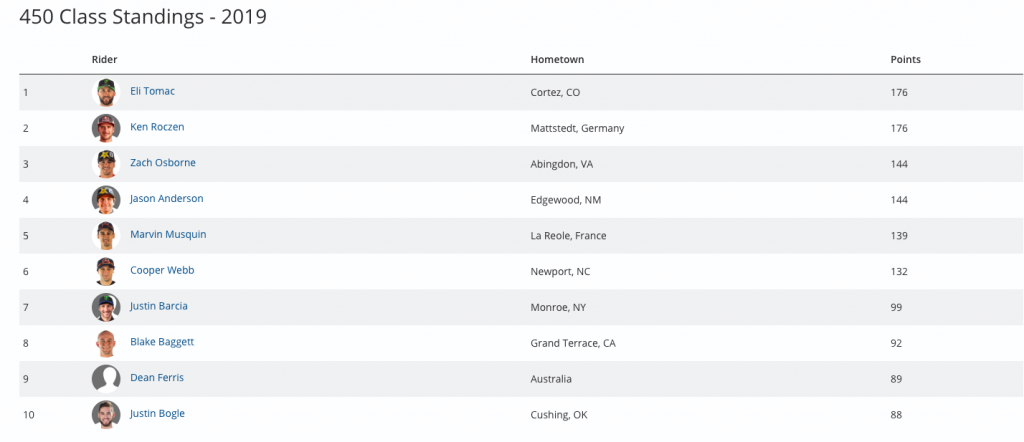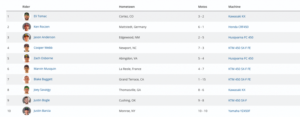 With the win, Tomac move to a tiebreaker with Roczen in the championship point standings with 176 points apiece. Teammates Osborne and Anderson are tied for third, 32 points out of the lead.