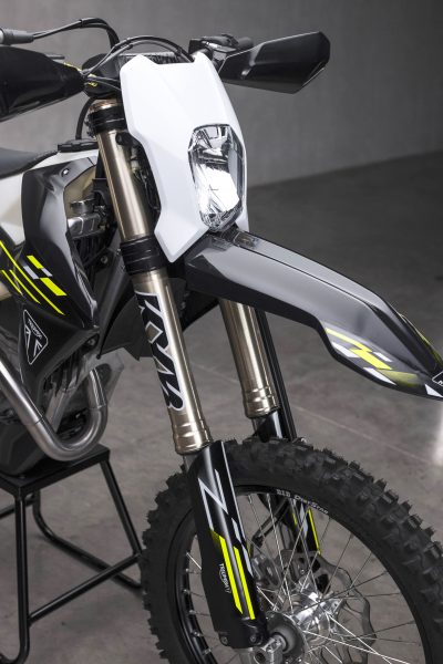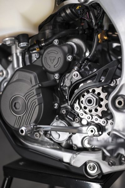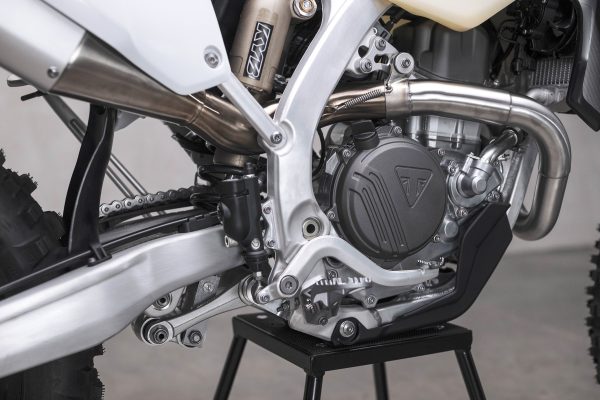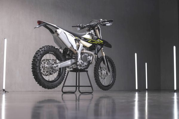 The motor in particular compared to the 450 MX machine has been built to be easier to ride and more rider friendly for the enduro conditions. In particular, the crankshaft in the TF450E is 30% heavier for increased inertia paired with a forged, high comp König piston which then creates a smoother and more controllable power delivery for the rider. There are also enduro-specific camshafts, a new 6-speed gearbox with quick shift capability, Exedy clutch system with a steel basket, GET ECU as standard and the exhaust system has been tweaked to meet the required enduro noise regulations. Triumph is claiming 90-hour service intervals as well on the enduro bikes and it’s also extremely impressive and worth noting that the motors are completely built from scratch in-house in their state-of-the-art facilities in the UK.