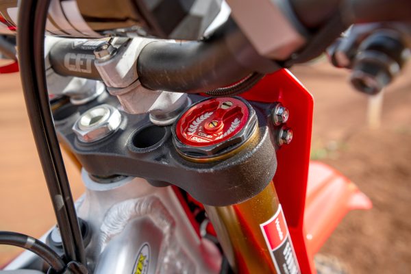 While I was sitting on the Honda CRF450R tossing up bar and lever positioning I felt something a little weird that made me think we had a flat front tyre. The bike was off the stand and it was so damn hard to turn the bars from side to side. I popped the bike up on a stand and went to grab a tyre gauge when I realized it wasn’t tyre pressure. Webster has his head stem set that tight that it almost feels like a desert racer’s steering dampener on steroids.