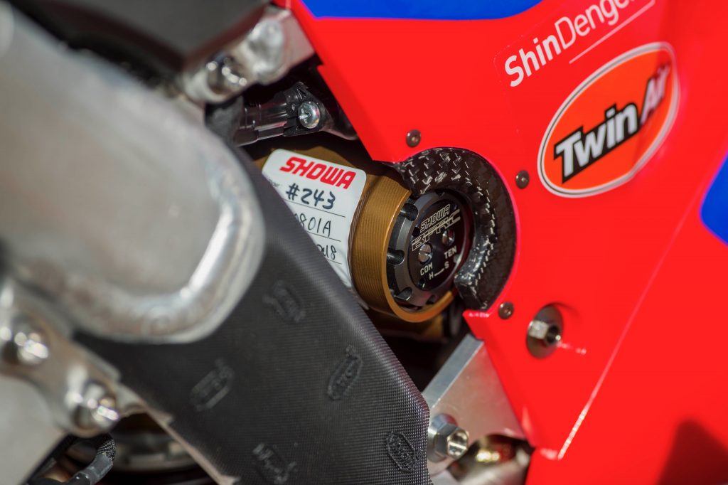 The factory bikes are shod with Pirelli tyres, Showa’s SFF Air suspension and a number of custom performance parts such as billet titanium footpegs, titanium bolts to reduce weight, factory-spec cylinder head and camshaft and custom Yoshi exhaust.