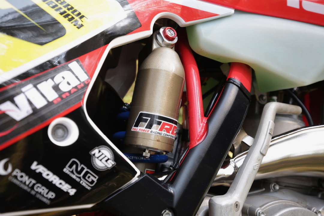 The main area I wanted to adjust was the suspension, so Full Force Racing Components helped me to get it soaking up all the small square-edge bumps better. I’m 96kg so we went to heavier fork and shock springs. I alter the rear brake a lot to make it a lot harder to drag as I have a bad habit of cooking them.