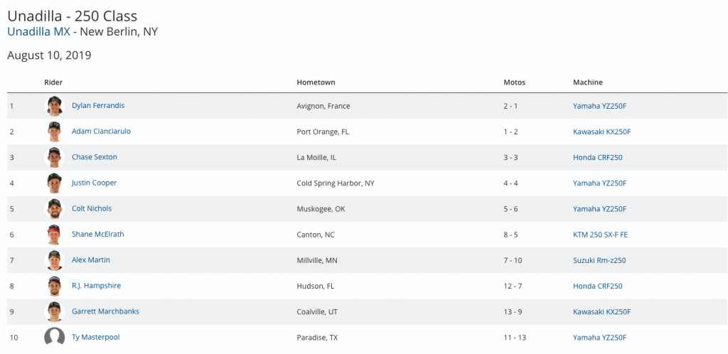 With the race winding down, Ferrandis remained consistent at the head of the 40-rider field to keep Cianciarulo at bay and take his seventh moto win of the season by 1.1 seconds. Cianciarulo finished just behind in second, followed by Sexton in third.