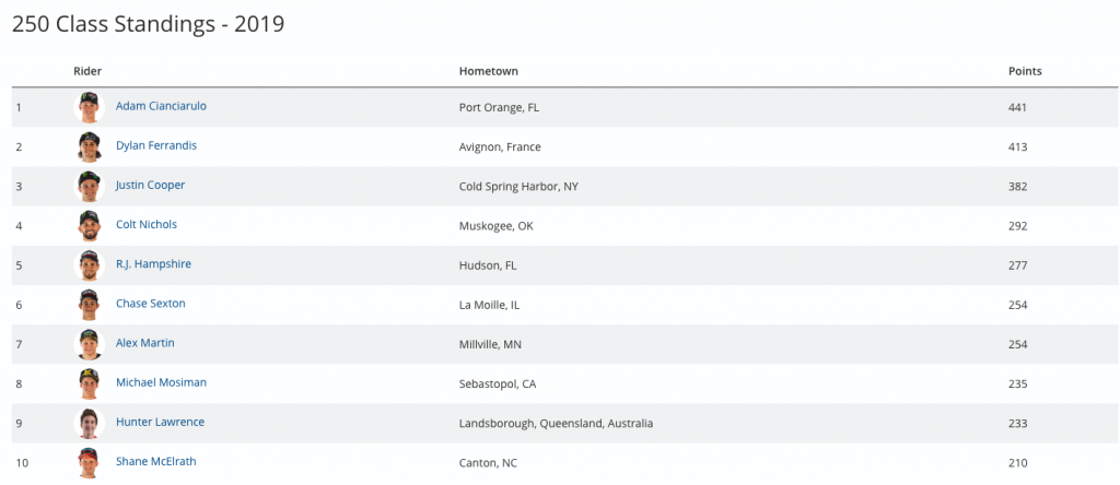 Cianciarulo’s tiebreaker finish with Ferrandis was good enough to keep his championship lead at 28 points. Cooper maintains his solid hold of third, 59 points out of the lead.