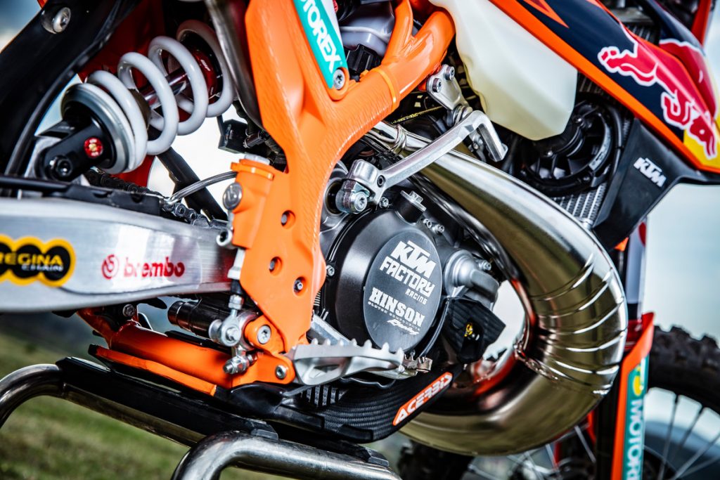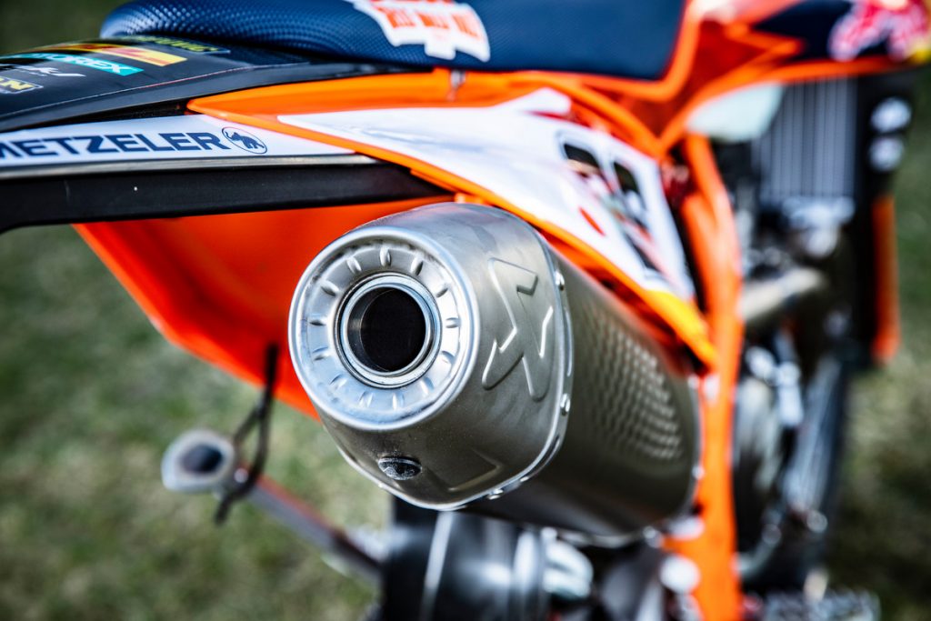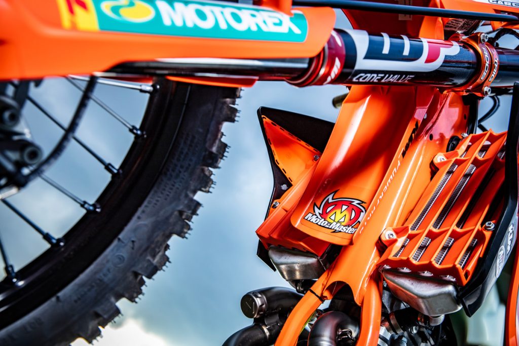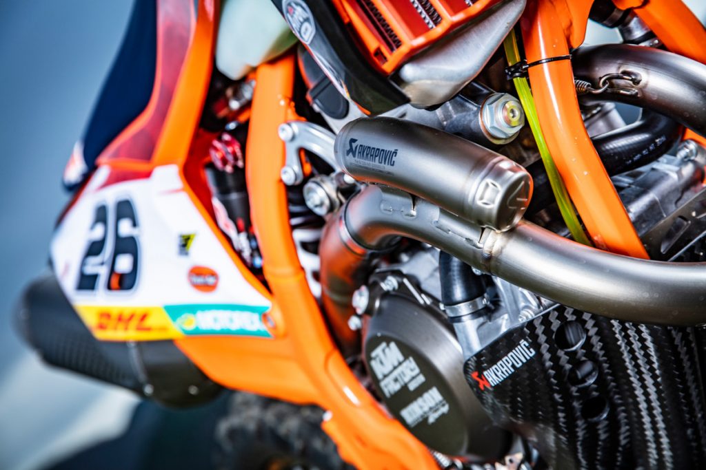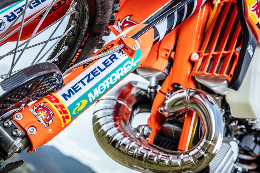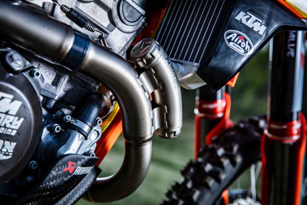 Besides all of the performance parts and bling fitted to these race machines, one of the more interesting components is the corregated expansion chamber which KTM claims improves durability.