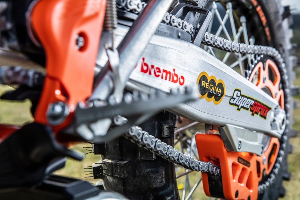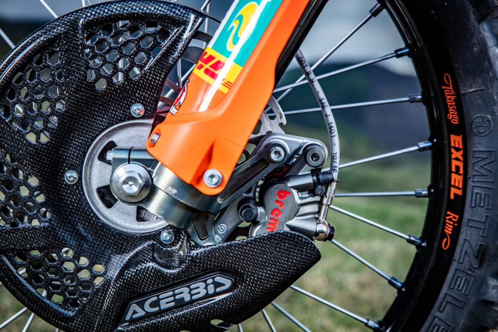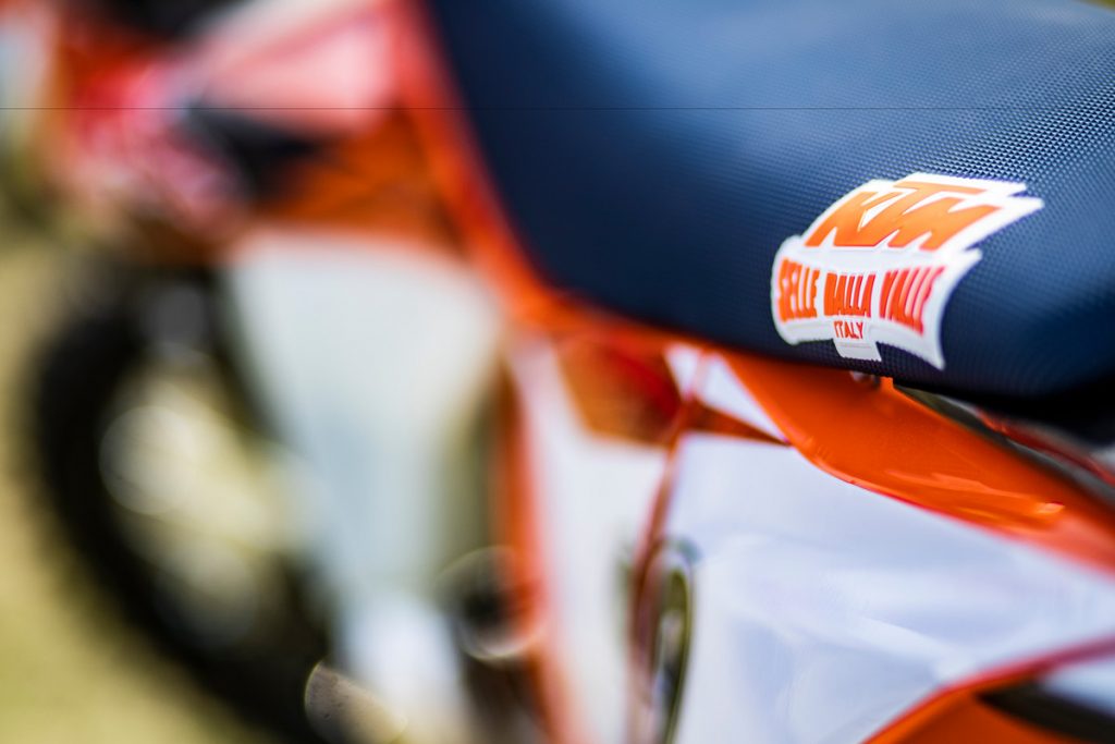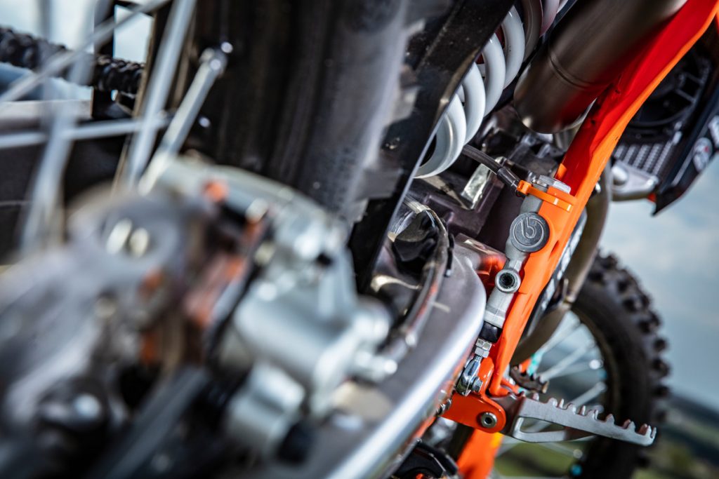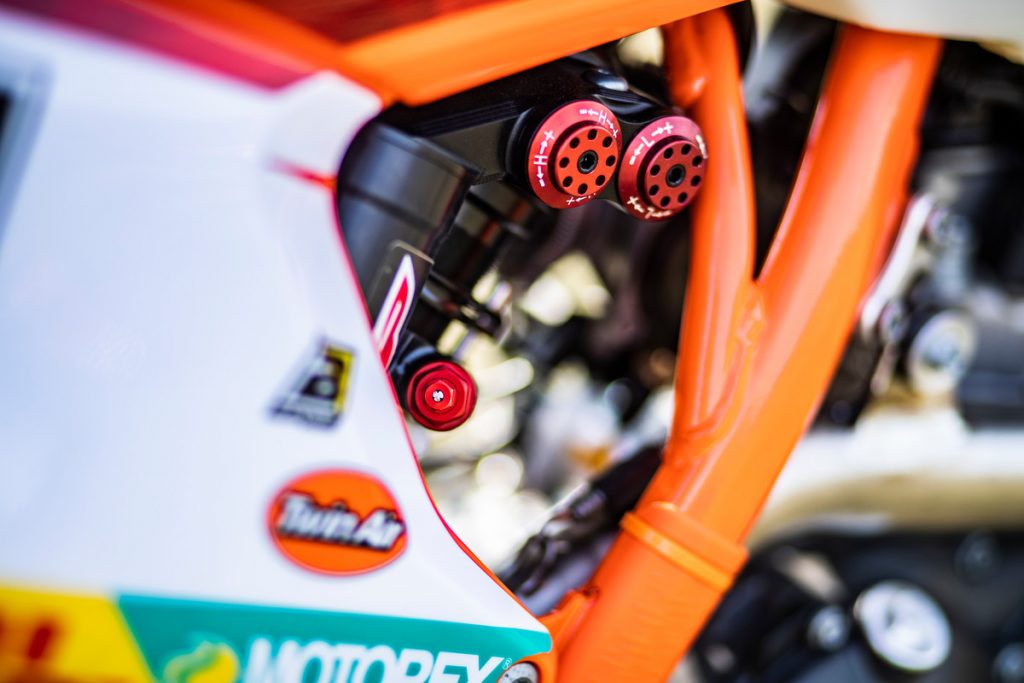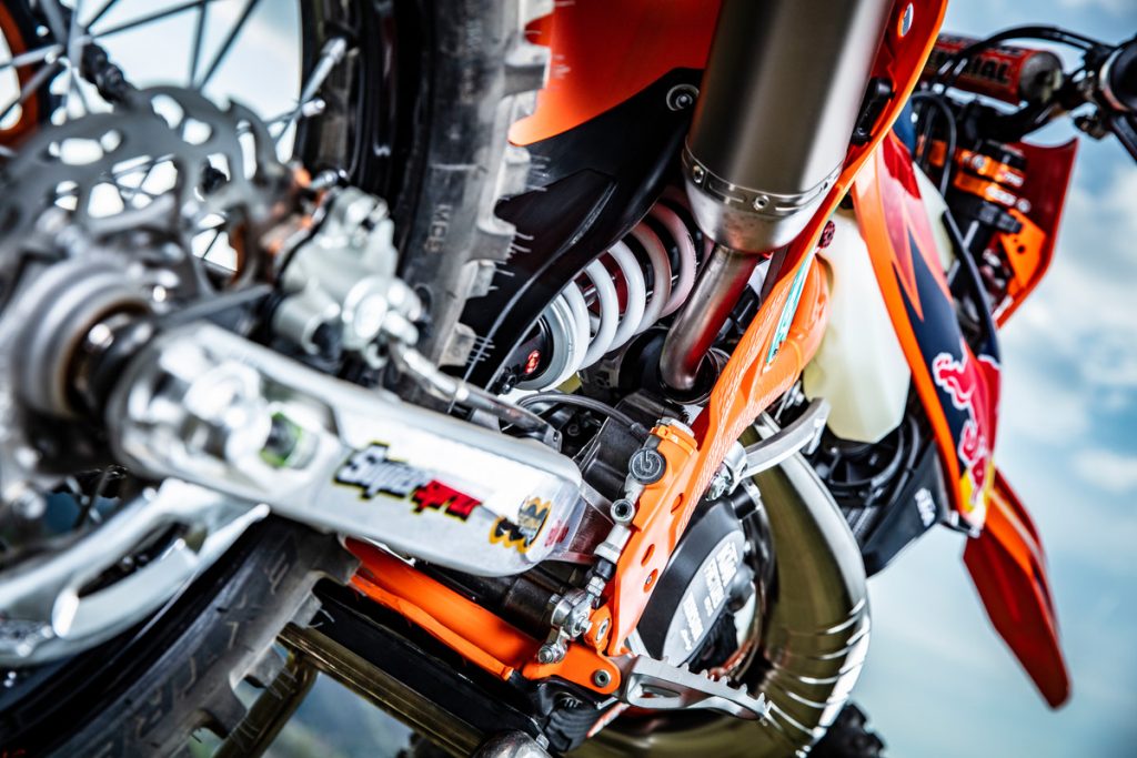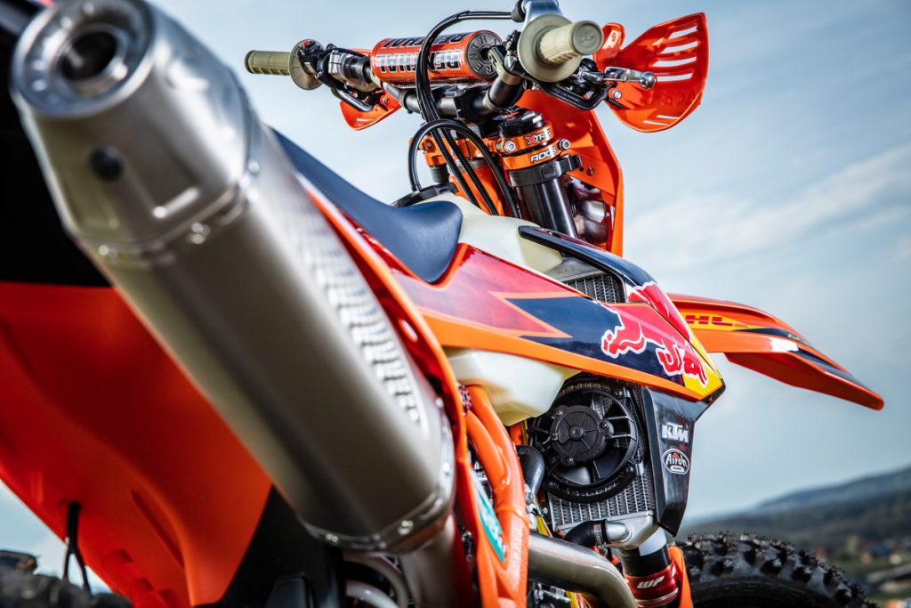 Besides all of the performance parts and bling fitted to these race machines, one of the more interesting components is the corregated expansion chamber which KTM claims improves durability.