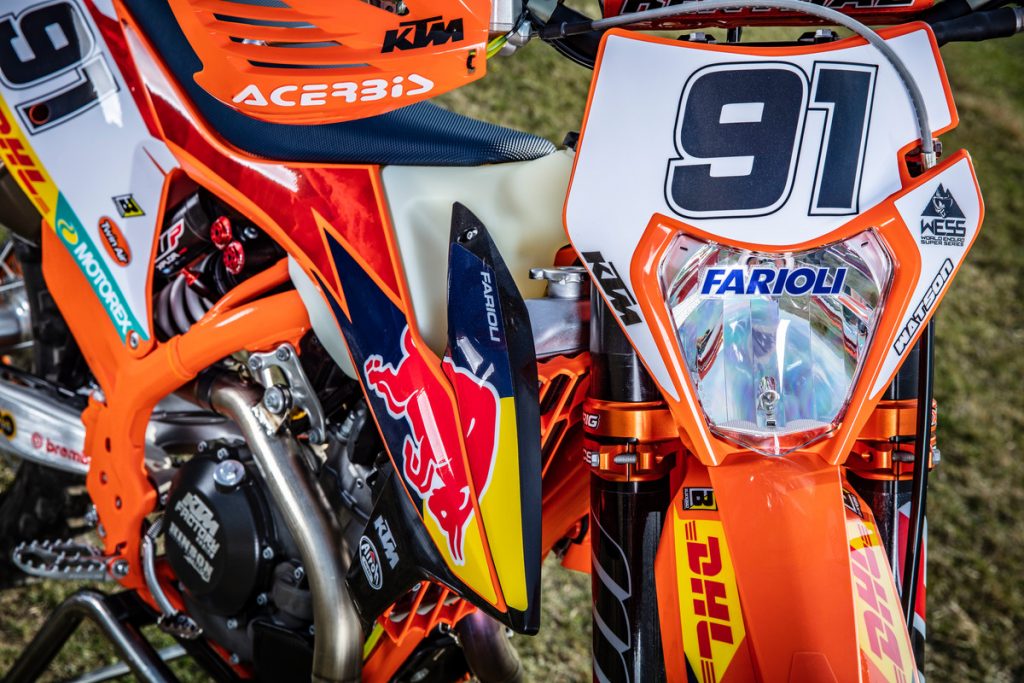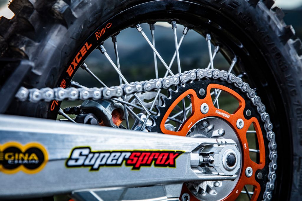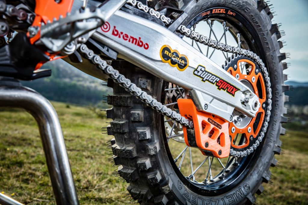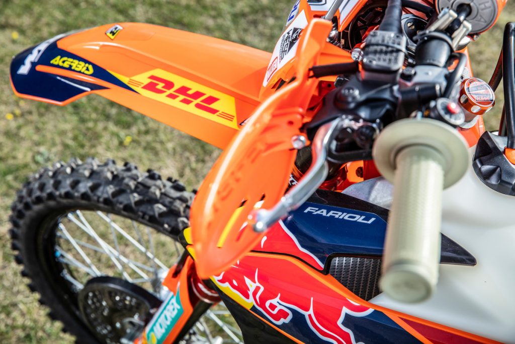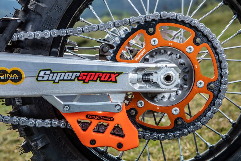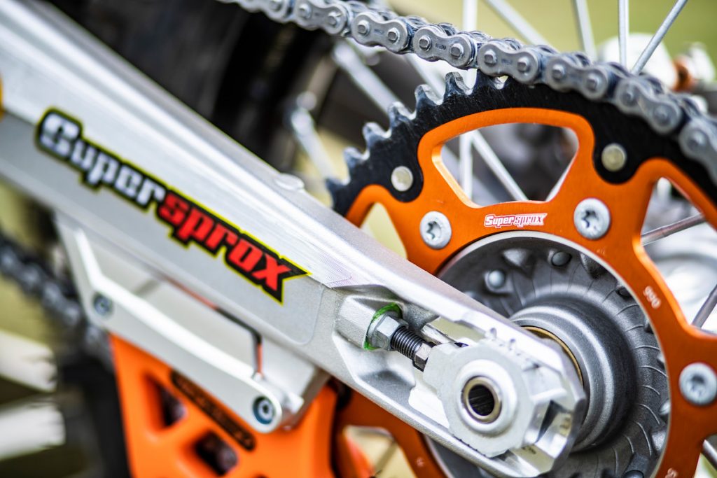 Besides all of the performance parts and bling fitted to these race machines, one of the more interesting components is the corregated expansion chamber which KTM claims improves durability.