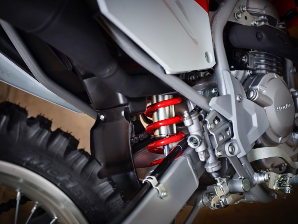 Braking is handled with new petal-style rotors for improved modulation, heat transfer and mud clearing and the CRF race-inspired aggressive, compact bodywork allows improved rider/machine interface.