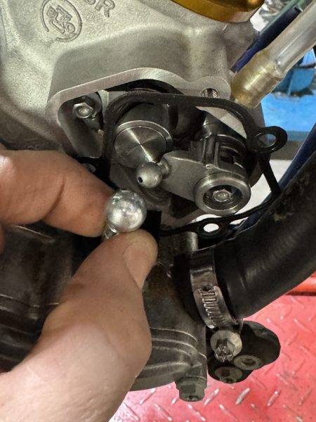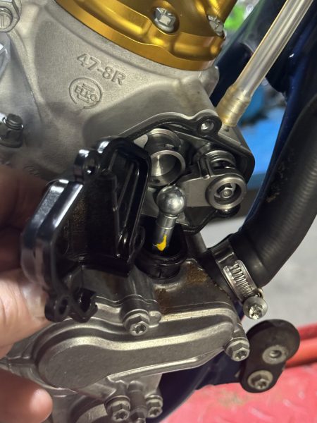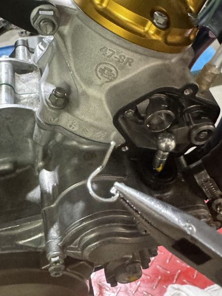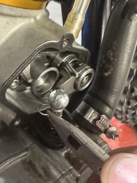 Once the cover has been removed you will see the wire clip securing the power valve. This is a ball and socket joint that presses together and the wire clip acts as a retainer so the joint will not come apart. However, to remove the cylinder to do a top-end rebuild, you will need to disconnect this power valve joint.