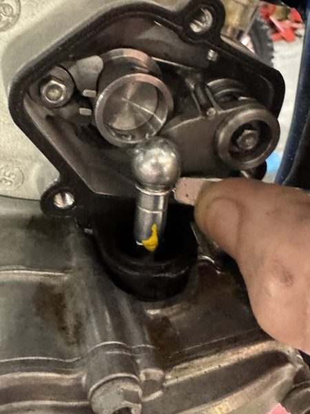 Fit the lower rubber sealing grommet and power valve gasket before pushing the power valve joint together. If you push the socket end of the power valve arm onto the ball end you will feel it pop into place. You will need to push it on all the way as far as it goes or the wire securing clip will not fit.