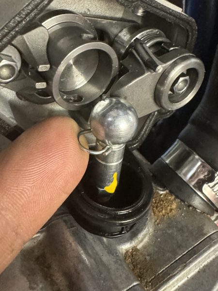 Now that the wire retaining clip has been removed you can disconnect the power valve joint. The joint is a ball and socket so prying the ball end away from the cylinder will cause it to pop loose and then you can remove the cylinder.