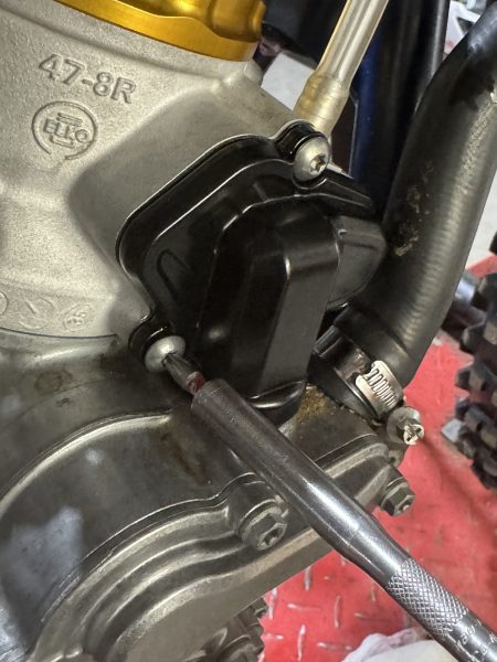 To access the clip you will need to remove the power valve cover. To do this you need to remove the power valve cover screws using a Torx bit. Once removed set the screws aside to be refitted later on.
