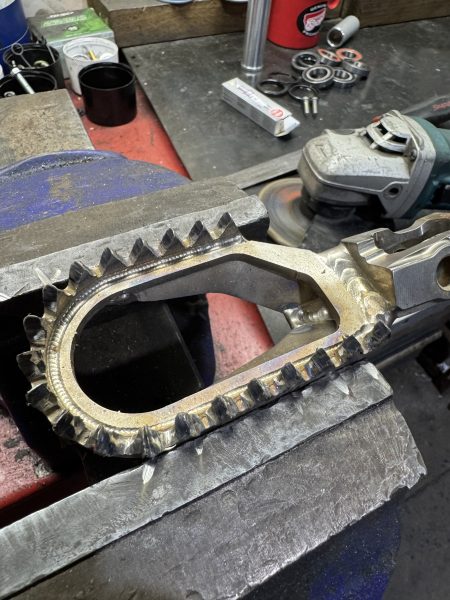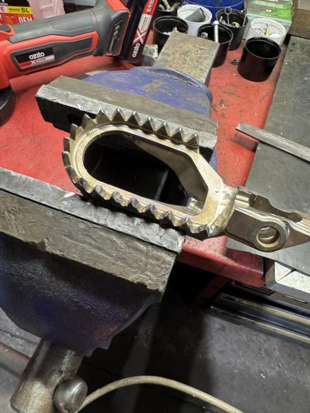It’s much easier and quicker to use a file to sharpen steel foot pegs—you can even do them without removing the pegs from the bike. Unfortunately, with titanium pegs you’ll rub all day with a file and likely only wear the file out. This is the reason there’s no choice but to use a grinder to sharpen titanium foot pegs.