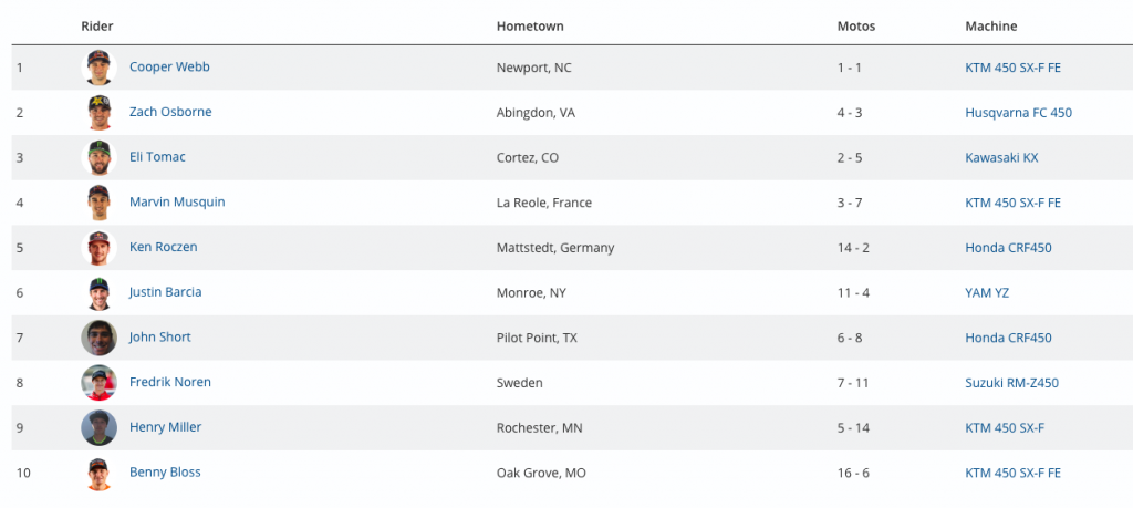 Osborne (4-3) and Tomac (2-5) ended up in a tie for the runner-up spot. However, Osborne’s better second moto finish of third gave him the tiebreaker, dropping Tomac to third.
