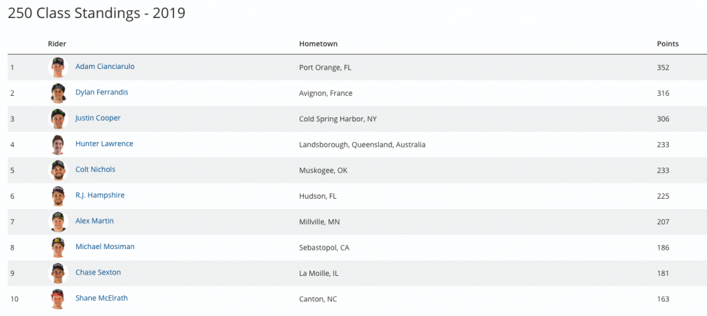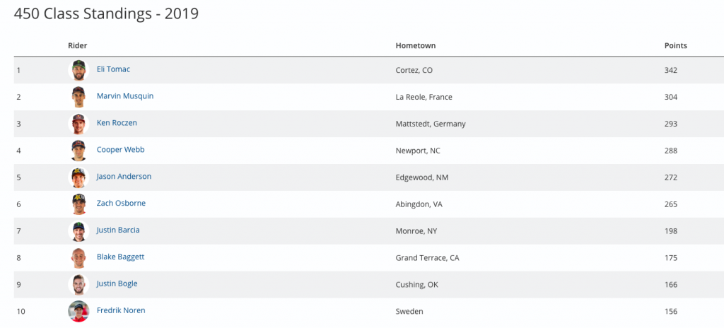 Tomac’s unblemished podium streak in 2019 was good enough to extend his lead in the 450 Class standings to 38 points. Musquin, who finished fourth overall (3-7), remains second. Roczen, who finished fifth (14-2), continues to hold onto third and trails Musquin by 11 points.
