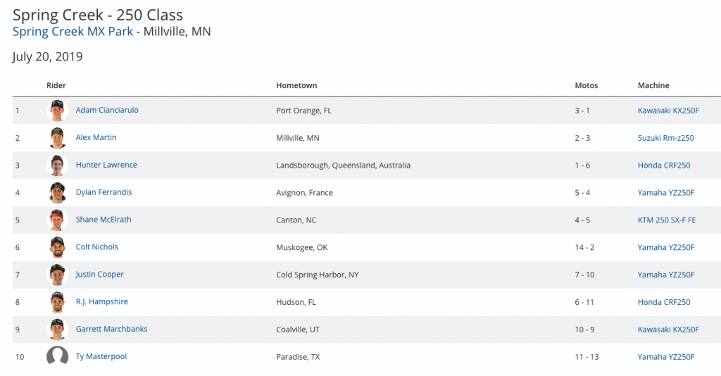 The 1-1 moto scores by Webb netted him both the first overall podium and overall victory of his career. He becomes the 69th different 450 Class winner in Pro Motocross history, and just the second to do so at Spring Creek MX Park.